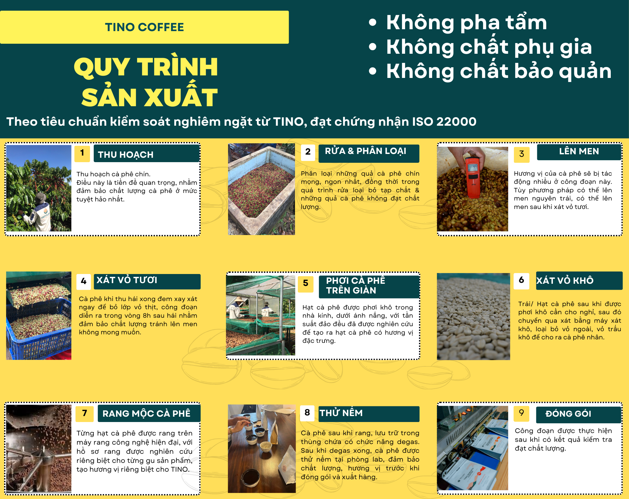 ► QUY TRÌNH CHẾ BIẾN: Sử dụng cà phê có tỷ lệ trái chín 100%, kiểm soát quá trình lên men (ủ) chuyên biệt cho từng dòng sản phẩm, áp dụng quy trình chế biến chất lượng cao, phơi trên giàn, kết hợp phơi dưới nắng mặt trời và trong nhà kín để tạo hương vị thơm ngon đặc trưng.